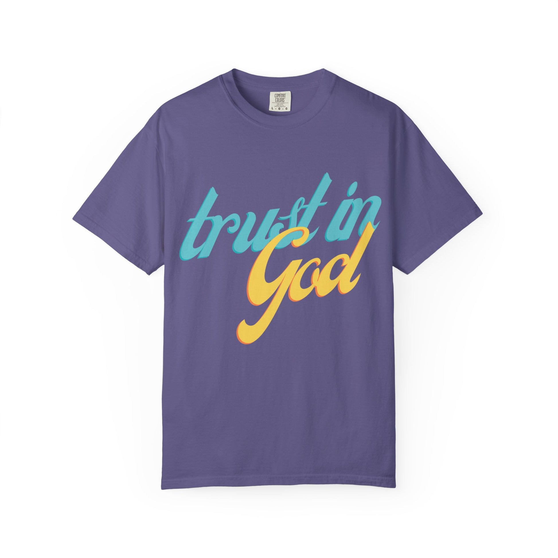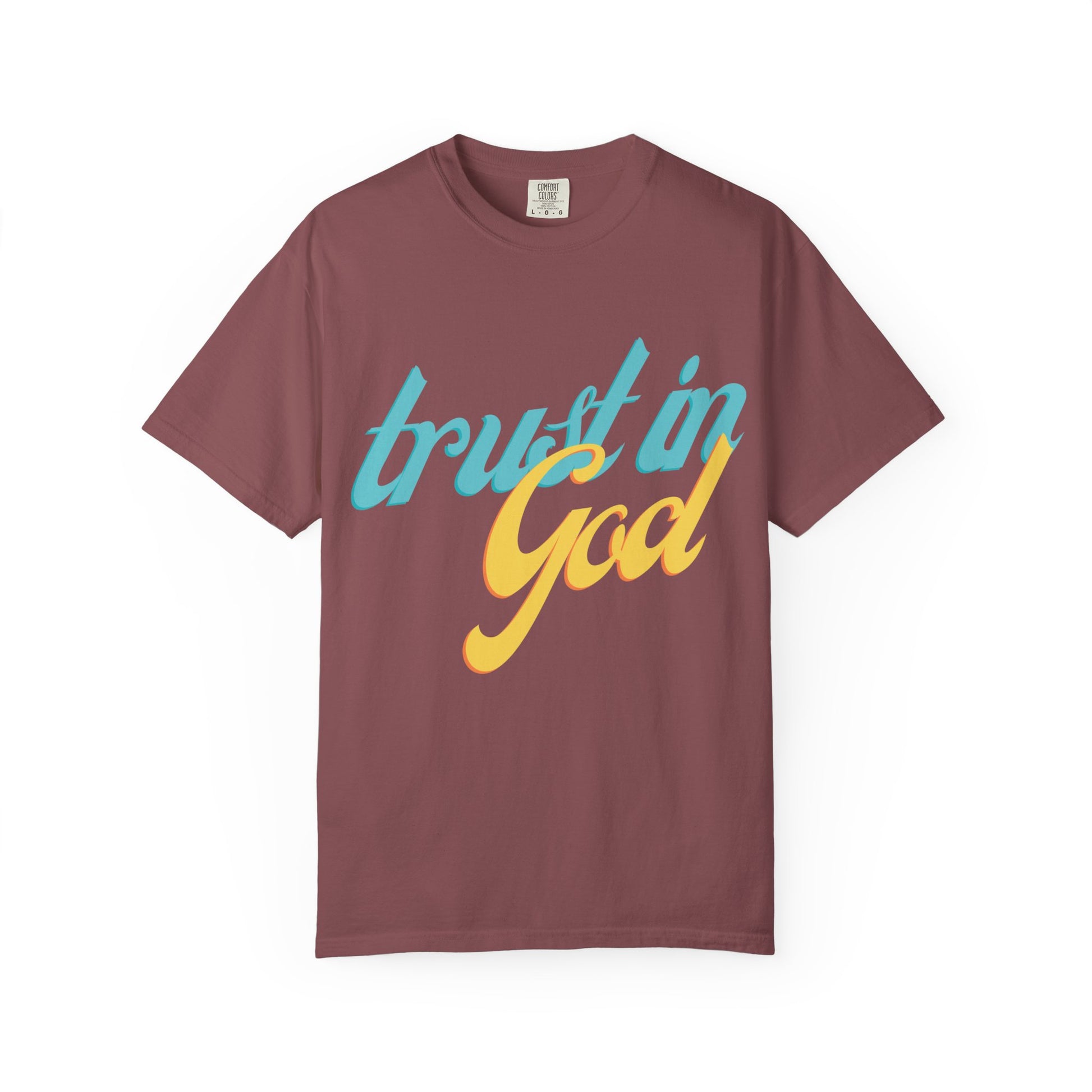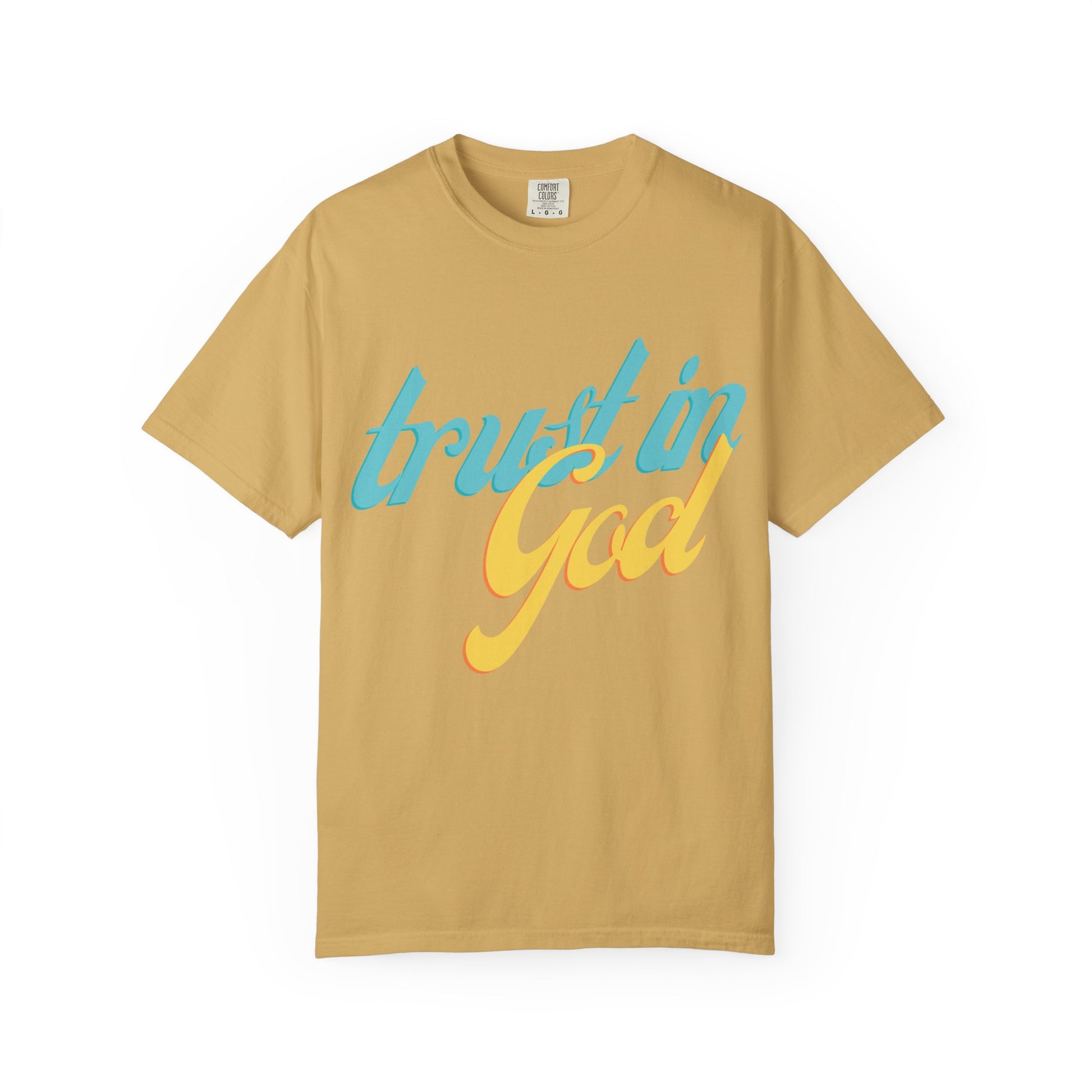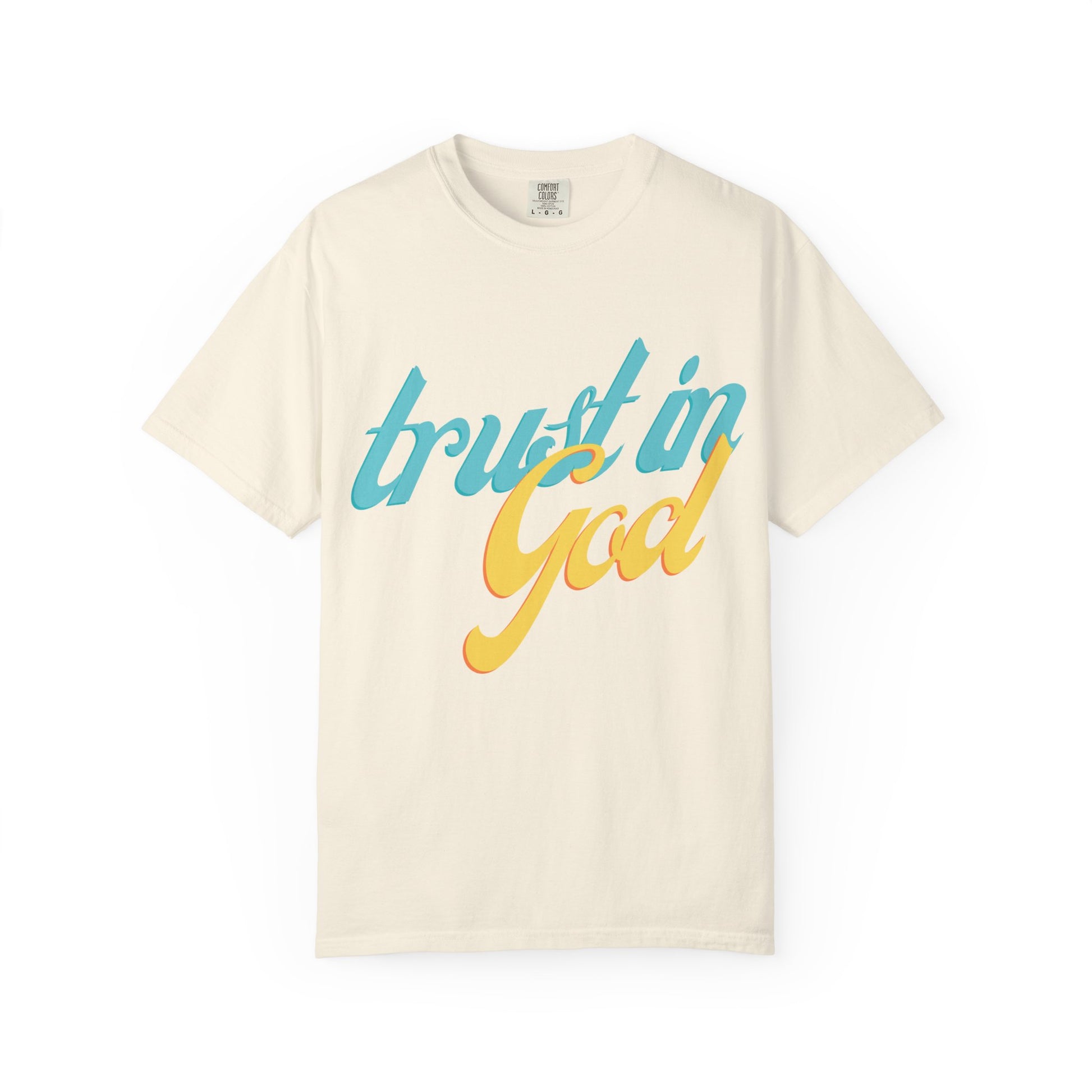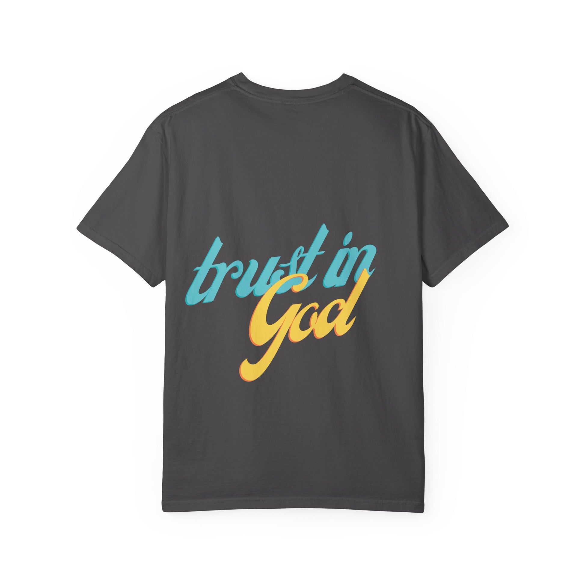 Soft, lived-in cotton with a quiet message that carries through the day. This relaxed-fit garment-dyed tee settles into your routine—warm at the touch, broken-in in the best way, and printed with a breezy two-tone “trust in God”.